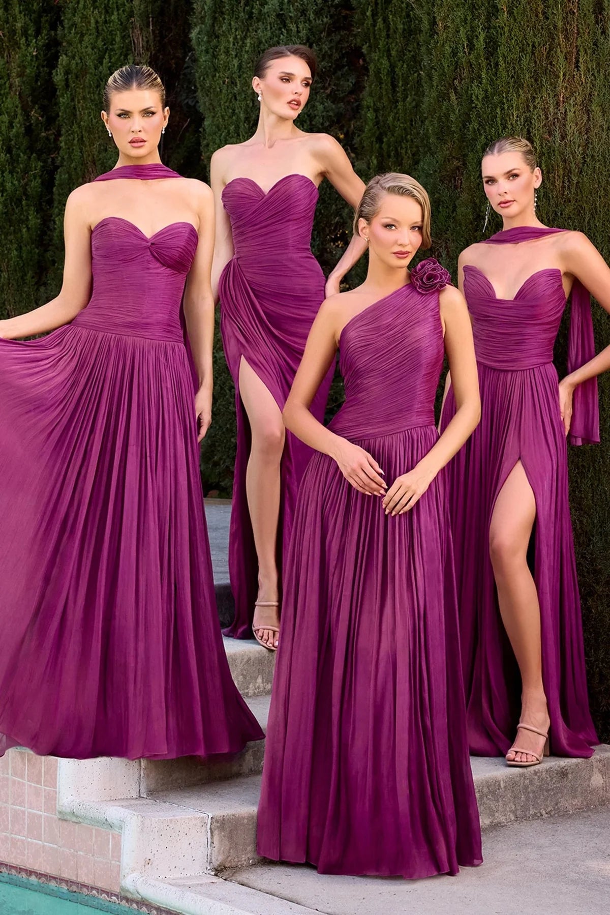 Radiating soft luminosity, this fitted gown showcases a sweetheart strapless neckline and meticulous pleated detailing crafted from glowing chiffon. The fabric drapes and gathers across the bodice and hips, creating a sculpted silhouette that enhances every curve. A dramatic thigh-high slit adds movement and allure, while the lace-up corset back ensures a customizable and secure fit. Finished with an optional matching chiffon scarf, this gown feels timeless yet modern—perfect for prom, weddings or any unforgettable celebration.